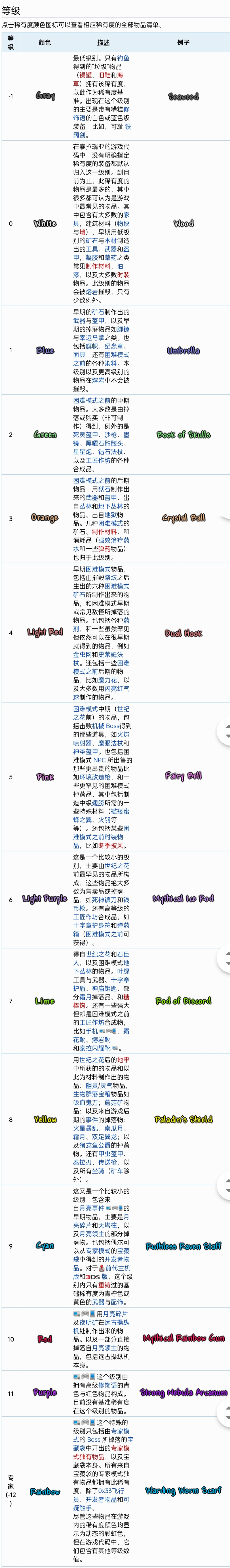 稀有度是所有物品都具備的一項屬性,它能粗略地體現出物品的價值與獲取的難度。在遊戲內,物品的稀有度體現於其名稱文字的顯示顏色。任何稀有度為白色或灰色的物品一旦接觸到熔岩即會被摧毀,只有極少數例外。藍色到紫色的物品,以及彩虹色或琥珀色的物品在接觸熔岩時並不會被摧毀。具體排行如下圖所示: