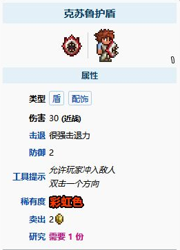 首頁 泰拉瑞亞 問答 泰拉瑞亞克魯蘇盾牌怎麼用? 2022-11-04 泰拉瑞亞克魯蘇盾牌使用方法解析如下:《泰拉瑞亞》遊戲里的克魯蘇之盾可以通過雙擊左鍵或者右鍵使用,使用後可以對目標造成一次沖鋒打擊,造成30點傷害並且獲得短時間的無敵效果,玩家開啟克魯蘇之眼掉落的寶藏袋後有機會獲得。