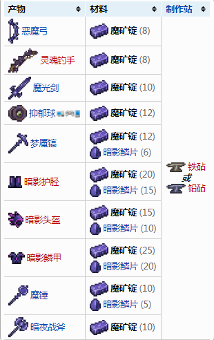首頁 泰拉瑞亞 問答 泰拉瑞亞魔礦錠先做什麼好? 2022-11-04 泰拉瑞亞魔礦錠是一個十分重要的礦石材料,可以用來製作許多的物品,推薦先做夢魘鎬可以挖後期的礦石,其次是暗影套裝。魔礦錠可用於以下物品製作: