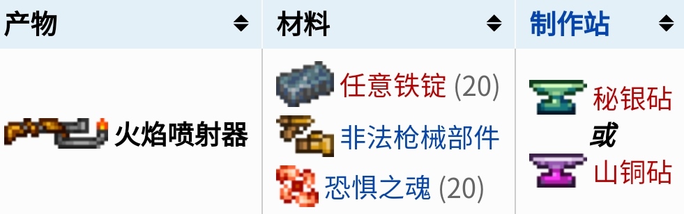 在泰拉瑞亞這款遊戲中,玩家可以使用20塊任意鐵錠、非法槍械部件和20個恐懼之魂在秘銀砧或山銅砧處合成獲得火焰噴射器。
