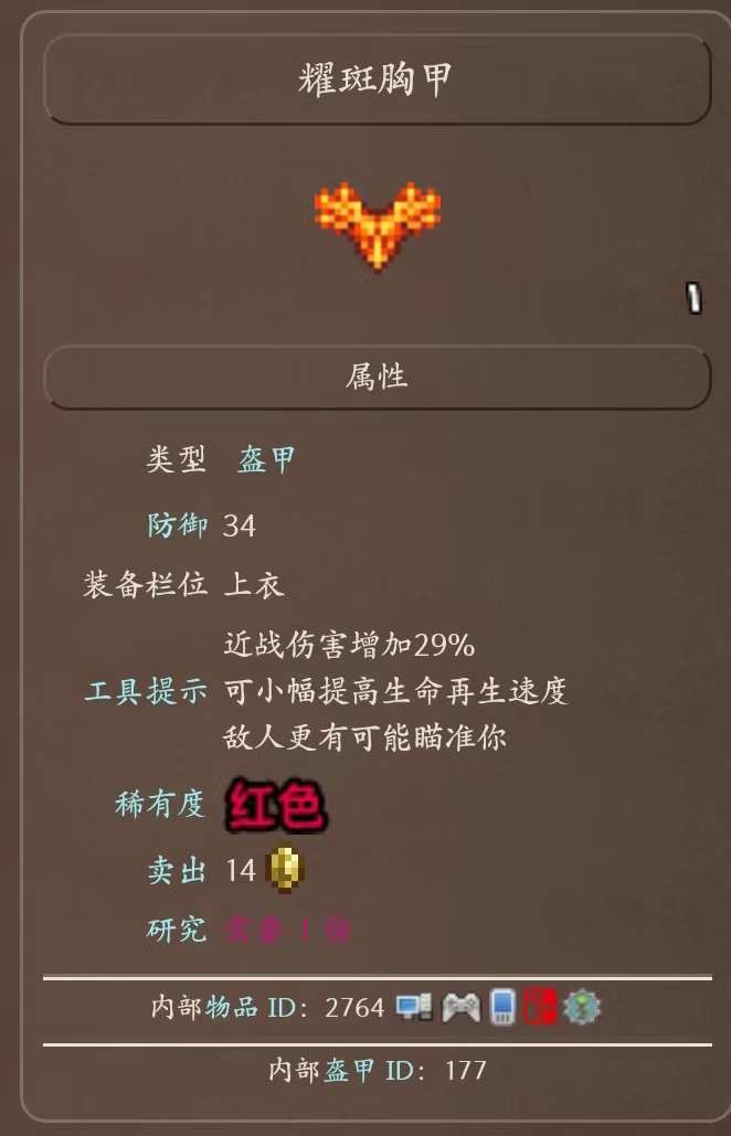2、耀斑胸甲:提供34點防禦力,近戰傷害增加22%和敵人更有可能瞄準你。