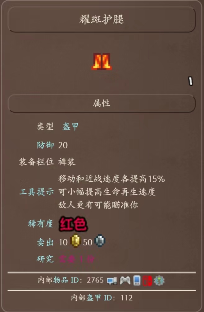 3、耀斑護腿:提供20點防禦力,移動和近戰速度各提高15%和敵人更有可能瞄準你。