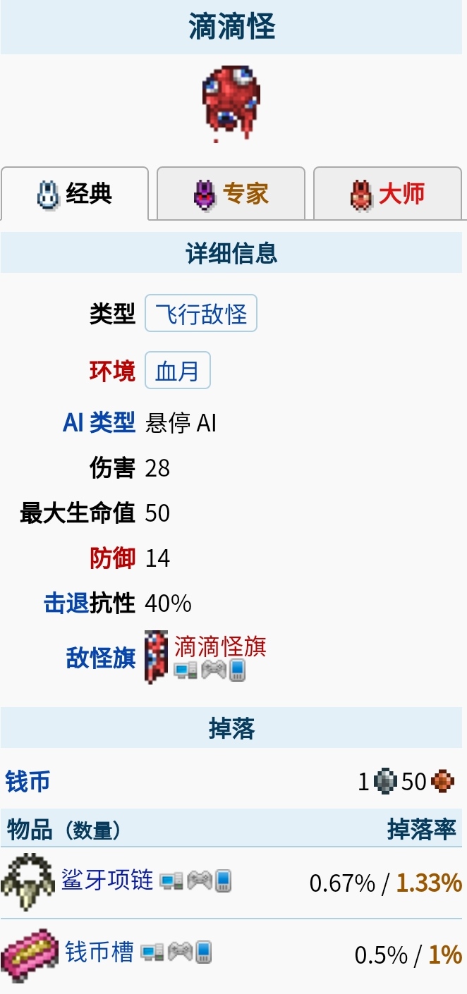 首頁 泰拉瑞亞 問答 泰拉瑞亞滴滴怪掉什麼? 2022-11-06 滴滴怪是只會在血月期間生成的飛行敵怪。它們懸浮在地面以上並緩慢的飄向玩家,但大多數武器都能輕易將其擊退。它們會以很低的概率掉落鯊牙項鏈或錢幣槽。
