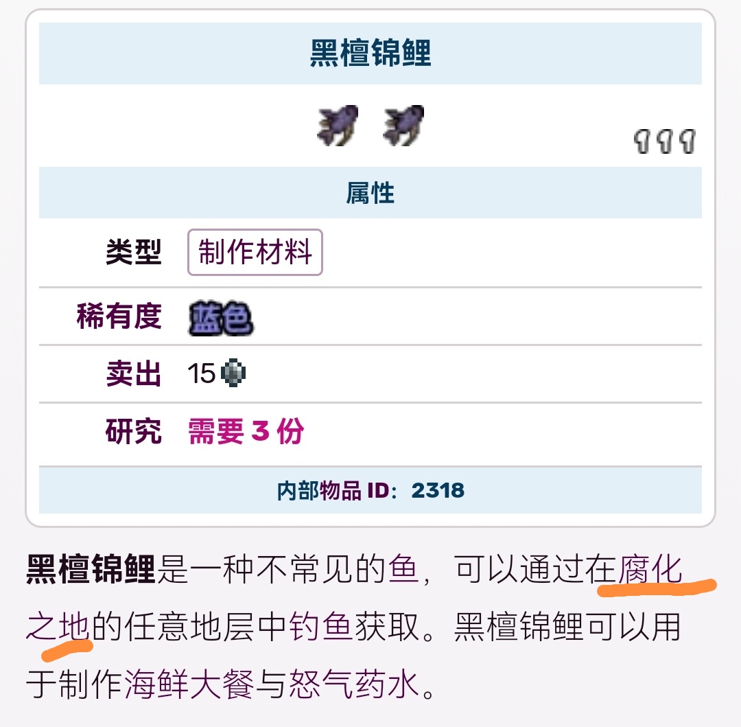 首頁 泰拉瑞亞 問答 泰拉瑞亞黑檀錦鯉在哪? 2022-11-06 黑檀錦鯉存在於腐化之地中,是一種不常見的魚,通過釣魚獲得,但是概率並不是很高,可以通過在腐化之地的任意地層中釣魚獲取,你也有可能會釣到其他物品。黑檀錦鯉可以用於製作海鮮大餐與怒氣藥水。