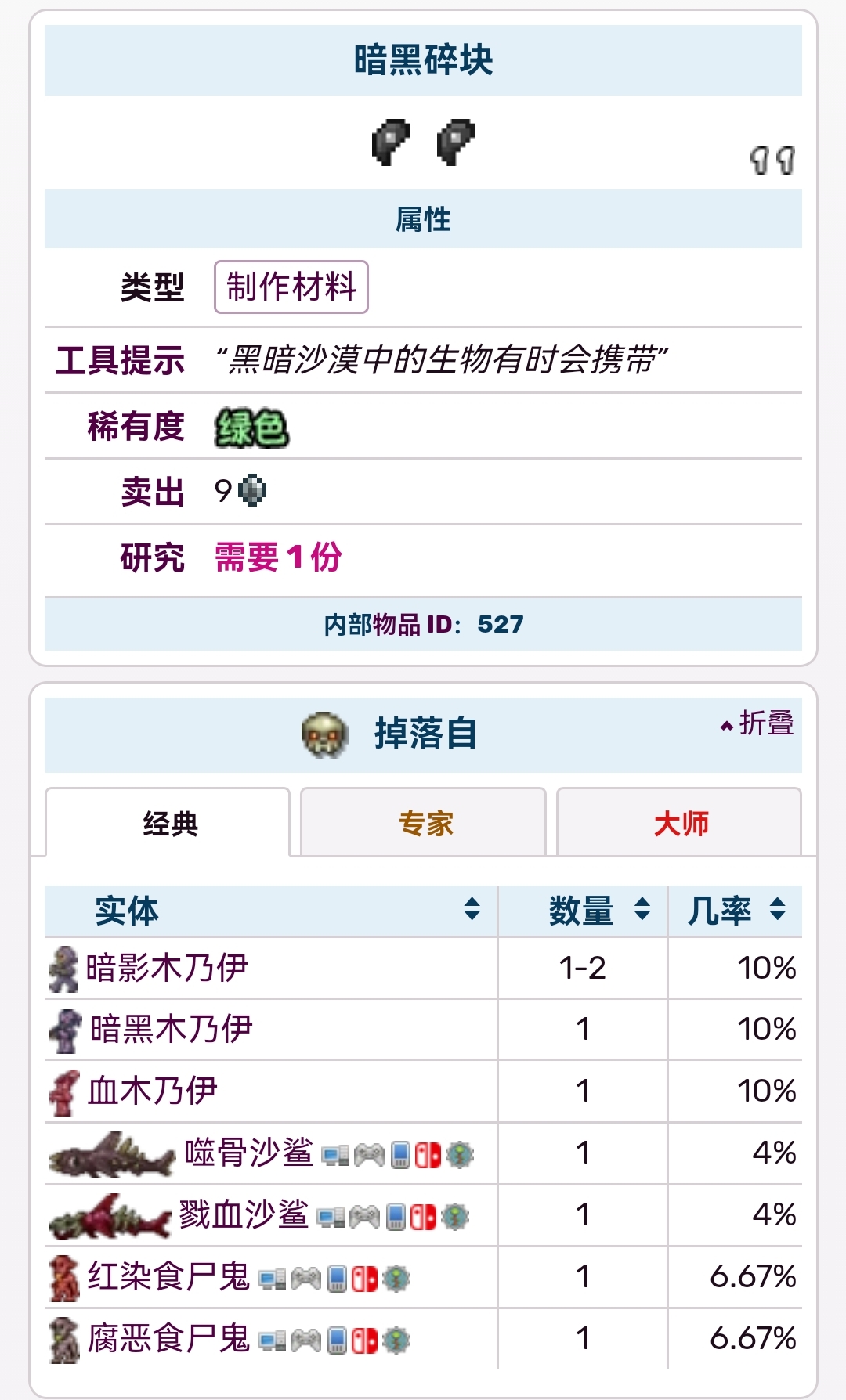 首頁 泰拉瑞亞 問答 泰拉瑞亞暗影碎片怎麼得到? 2022-11-06 暗影碎片可以通過打木乃伊的變種腐化木乃伊或者猩紅木乃伊獲得,也可以打食屍鬼的變種紅染食屍鬼和腐惡食屍鬼,還有噬骨鯊魚和鹿血鯊魚獲得。