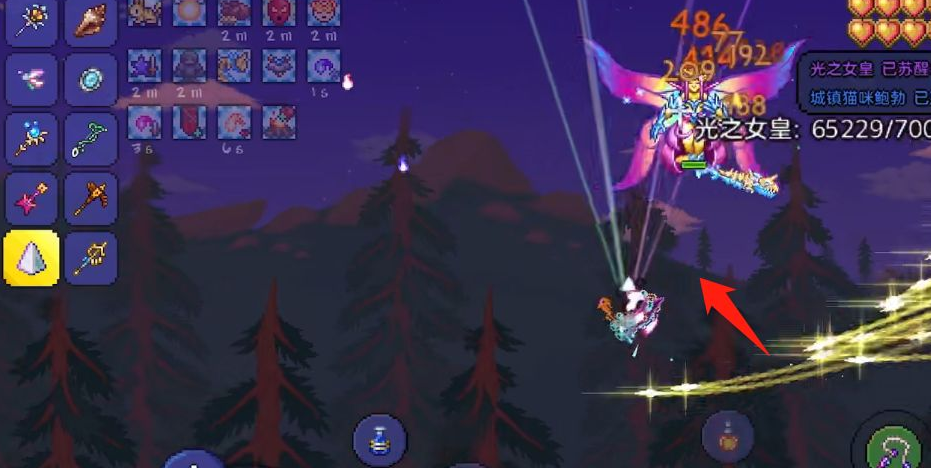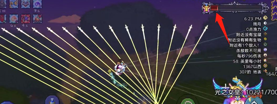 首頁 泰拉瑞亞 問答 泰拉瑞亞光明女皇怎麼打? 2022-11-07 1、首先BOSS使用彈幕攻擊,我們進行45度角飛行;如下圖所示:2、然後我們接著遠離BOSS,我們開啟自動瞄準鍵進行攻擊;如下圖所示:3、最後我們當BOSS絲血,然後我們傾斜45度飛行攻擊,即可擊敗BOSS。如下圖所示:
