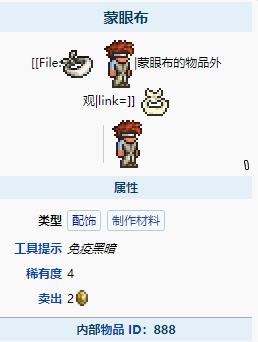 泰拉瑞亞蒙眼布是製作十字章護身符的配件之一,裝備蒙眼布的玩家也可以免疫黑暗減益,但是它對燈火管制和阻塞減益無效。