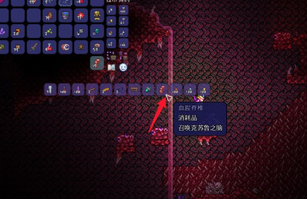 首頁 泰拉瑞亞 問答 泰拉瑞亞克魯蘇之腦召喚物怎麼合成? 2022-11-08 1、首先我們在血腥之地採集毒蘑菇。2、然後我們在血腥之地打小怪撿起椎骨。3、使用工作台將毒蘑菇轉化為毒粉。4、使用祭壇將椎骨和毒粉製作成克蘇魯之腦召喚物,即血腥脊椎。