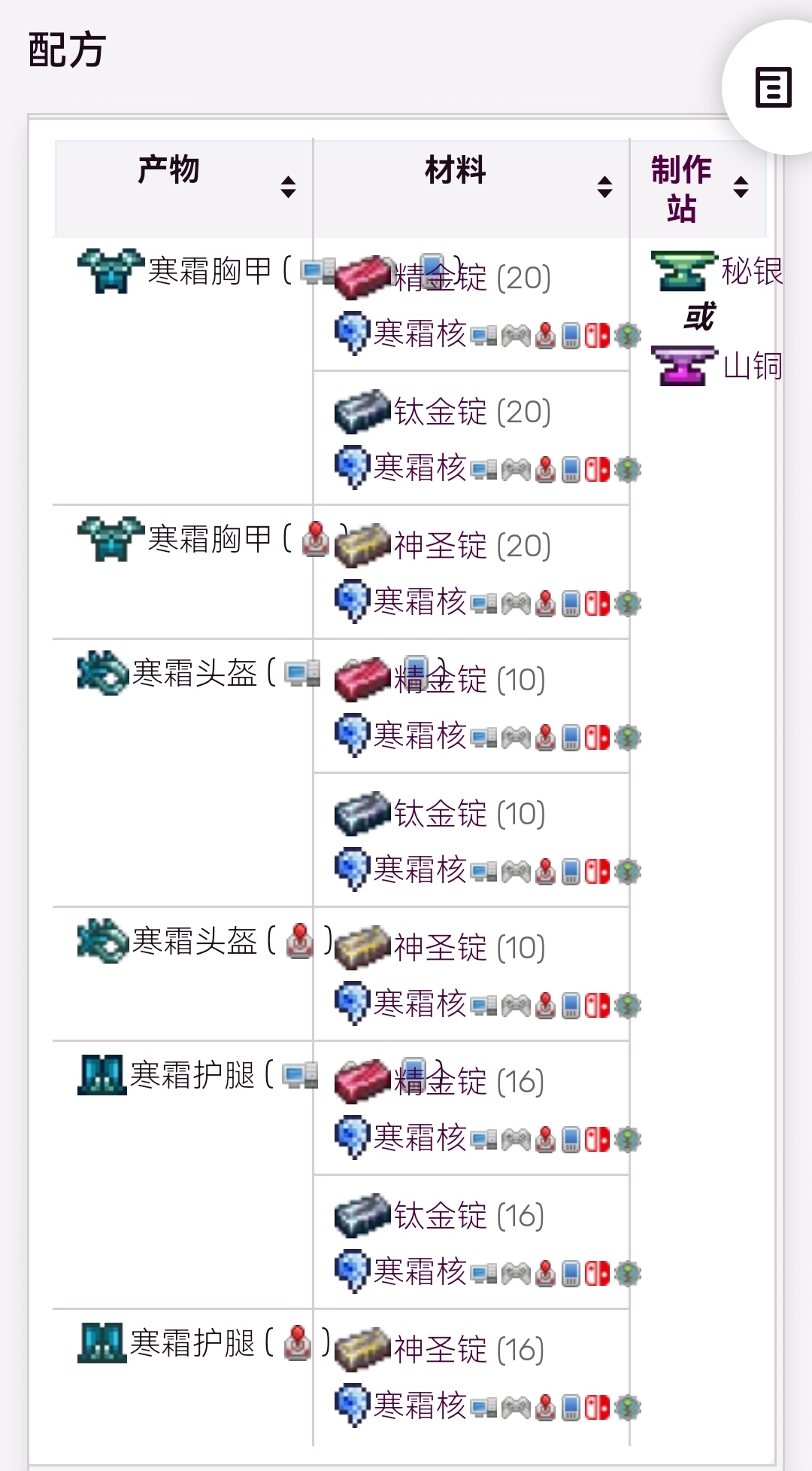 首頁 泰拉瑞亞 問答 泰拉瑞亞寒冰套裝怎麼合成? 2022-11-08 寒霜盔甲是一套困難模式盔甲套裝,穿著全套時會提供使近戰和遠程攻擊對敵怪造成凍傷 / 霜凍 的能力,並使所有近戰和遠程攻擊發光。製作全套的寒霜盔甲總共需要 46 個精金或鈦金錠和 3 個寒霜核。
