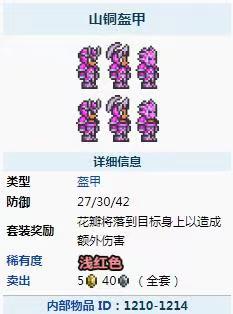首頁 泰拉瑞亞 問答 泰拉瑞亞秘銀套和山銅套哪個好? 2022-11-08 山銅套較好,理由介紹如下:在遊戲《泰拉瑞亞》中,山銅套裝屬於困難模式的盔甲套裝,是秘銀套裝的對應物,與其它困難模式下的礦石盔甲相同,因此二者屬性相同,但是山銅套裝比秘銀套裝外觀好看。