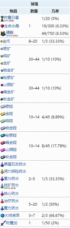 首頁 泰拉瑞亞 問答 泰拉瑞亞鈦金匣里有啥? 2022-11-08 鈦金匣是泰拉瑞亞遊戲中最珍貴的寶匣之一,打開它有概率掉落精金礦或鈦金礦。除此之外,它還有概率掉落製作天頂劍的原料附魔劍。具體的掉落物品如下圖所示。