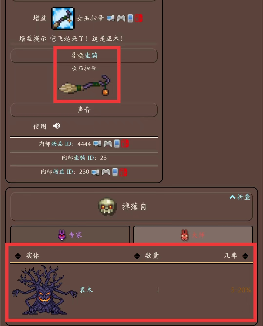 首頁 泰拉瑞亞 問答 泰拉瑞亞女巫的掃把是怎麼來的? 2022-11-09 女巫的掃把獲得方法:在遊戲《泰拉瑞亞》中,女巫掃帚是一個坐騎,由南瓜夜獨有怪物哀木在專家模式掉落獲得,當使用時,會召喚一個可騎乘的掃帚,允許玩家飛行和無限懸浮。