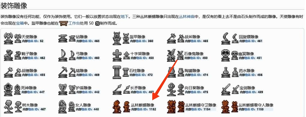 在泰拉瑞亞這款遊戲中,蜥蜴神像說的是叢林蜥蜴雕像這個物品,這個物品是無法進行召喚的道具。叢林蜥蜴雕像屬於裝飾雕像,沒有任何功能,僅作為裝飾使用,它們一般以放置狀態出現在地下。叢林蜥蜴雕像只出現在叢林神廟中,是僅有的看上去不是由石頭製作而成的雕像。