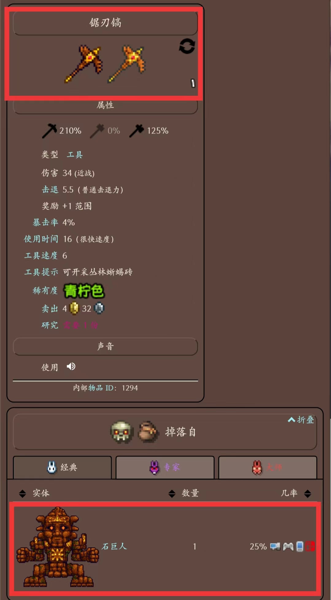 首頁 泰拉瑞亞 問答 泰拉瑞亞鋸刃鎬怎麼做? 2022-11-10 鋸刃鎬做法如下:在遊戲《泰拉瑞亞》中,鋸刃鎬是一個困難模式、石巨人之後鎬/斧頭,有1/4 (25%)或1/3 (33.33%)的幾率被石巨人boss掉落,它可以挖掘遊戲中的所有方塊。