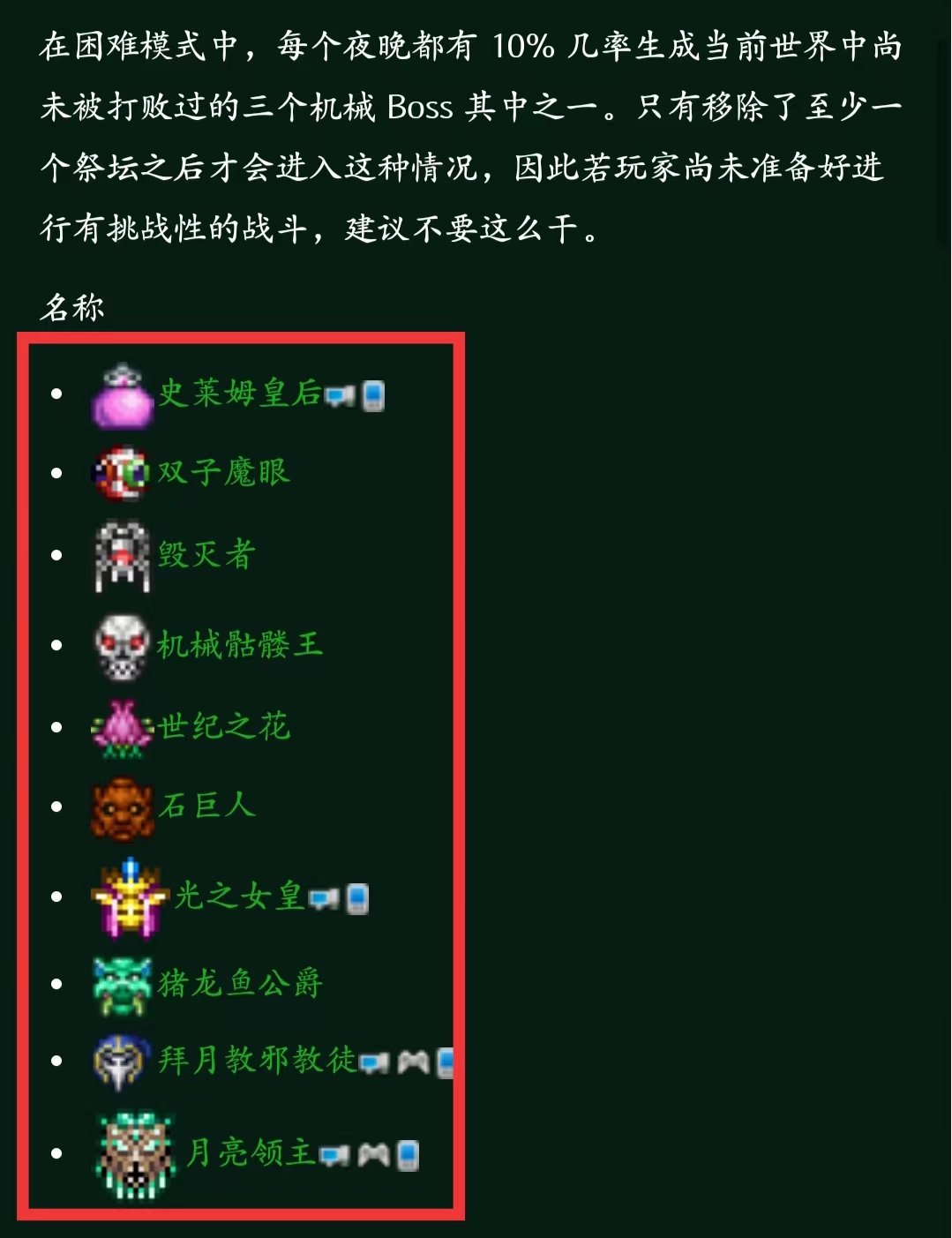 首頁 泰拉瑞亞 問答 泰拉瑞亞肉前boss流程是什麼? 2022-11-10 肉前boss流程介紹如下:在遊戲《泰拉瑞亞》中,肉山前boss的流程為克蘇魯之眼、史萊姆國王、骷髏王、克蘇魯之腦或世界吞噬者、蜂王、血肉之牆、雙子魔眼、世界毀滅者、機械骷髏王、世紀之花、石頭人、豬鯊、遠古信徒、月球領主。