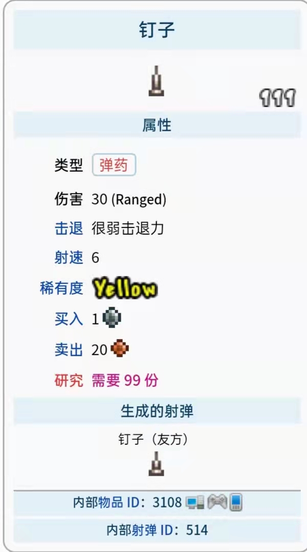 首頁 泰拉瑞亞 問答 泰拉瑞亞釘子怎麼獲得? 2022-11-10 釘子獲得方法介紹:在遊戲《泰拉瑞亞》中,釘子是一種僅由釘槍使用的彈藥,可以在日食期間得自釘頭。釘子從釘槍中射出,在撞擊後會延遲爆炸,不會傷到玩家或物塊,如果玩家的物品欄中持有,則可從商人或軍火商處以每個1銀幣的價格購買釘子。