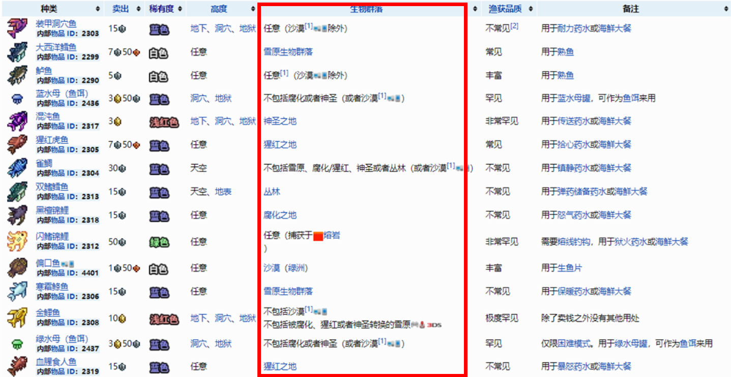 泰拉瑞亞大概8有種釣魚池(也就是魚的生物群落),有沙漠(綠洲),雪原,神聖之地,猩紅之地,叢林,腐化之地,熔岩,海洋,如下圖所示。