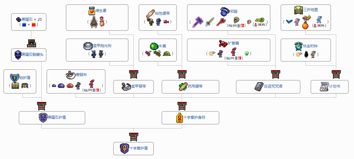 首頁 泰拉瑞亞 問答 泰拉瑞亞十字章護身符材料打什麼怪? 2022-11-11 十字章護身符是一種困難模式下的配飾,是由盔甲背帶、葯用綳帶、計劃書、反詛咒咒語和蒙眼布合成。十字章護身符製作樹如下,可參考哪些怪物掉落所需材料。