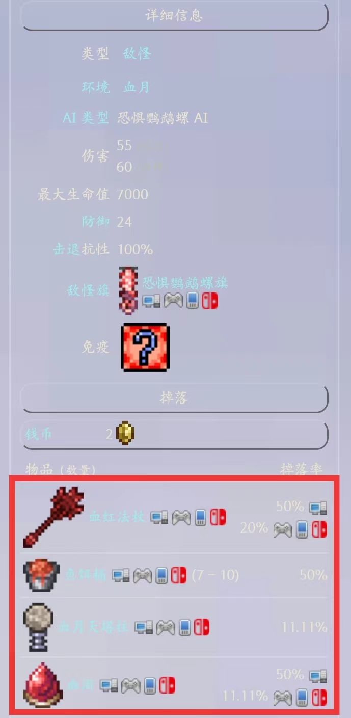 首頁 泰拉瑞亞 問答 泰拉瑞亞血月鸚鵡螺掉落物品是什麼? 2022-11-11 血月鸚鵡螺掉落物品介紹如下:在遊戲《泰拉瑞亞》中,恐懼鸚鵡螺是一種可在困難模式下的血月期間通過釣魚產生的敵怪,掉落物品有50%概率魚餌桶(7-10)、50%概率血紅法杖、11.11%概率血淚、11.11%概率血月天塔柱。