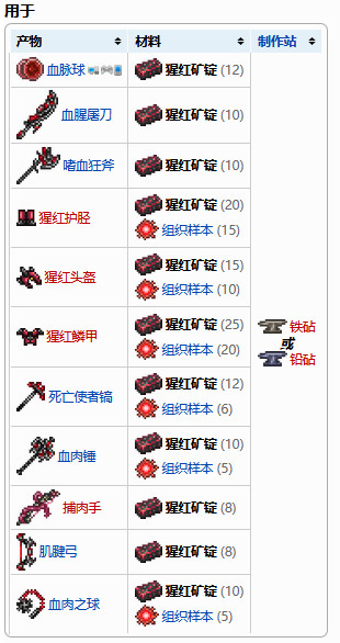 首頁 泰拉瑞亞 問答 泰拉瑞亞腥紅裝備怎麼做? 2022-11-11 猩紅裝備的製作如下圖所示,猩紅裝備的主要材料是猩紅礦錠,它是通過猩紅礦進行合成的,猩紅礦掉落於克蘇魯之腦,也可以在地下挖礦找到,有些裝備還需要用到組織樣本,這個會掉落於克蘇魯之腦,伴隨克蘇魯之腦的眼球怪也會掉落組織樣本。