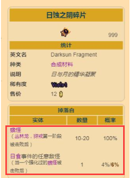 首頁 泰拉瑞亞 問答 泰拉瑞亞太陰碎片怎麼獲得? 2022-11-11 泰拉瑞亞太陰碎片(日蝕之陰碎片)獲得方法是玩家可以在擊殺叢林龍後獲得,另外擊敗犽戎第一階段後日食事件中的蛾怪也有較低概率掉落日蝕之陰碎片。
