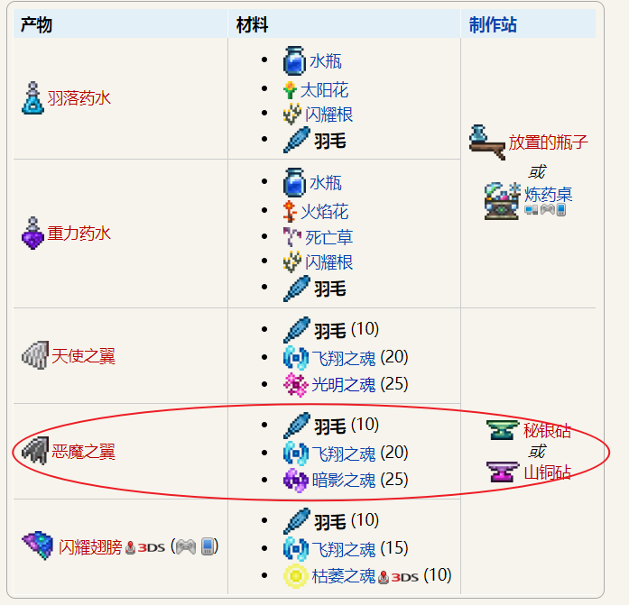 首頁 泰拉瑞亞 問答 泰拉瑞亞惡魔翅膀怎麼合成? 2022-11-11 泰拉瑞亞惡魔翅膀(惡魔之翼)可以在秘銀氈或者山銅氈處,使用羽毛、飛翔之魂和黑夜之魂製作。羽毛可以通過擊敗生成於高空的 鷹身女妖獲得。
