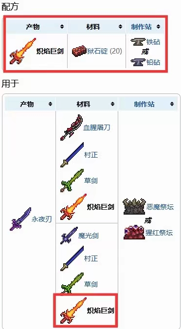 首頁 泰拉瑞亞 問答 泰拉瑞亞熾焰巨劍如何製作? 2022-11-11 熾焰巨劍製作方法:在遊戲《泰拉瑞亞》中,玩家在鐵砧或者鉛砧使用20個獄岩錠進行合成時,即可獲得熾焰巨劍,熾焰巨劍是製作永夜刃的關鍵材料之一。