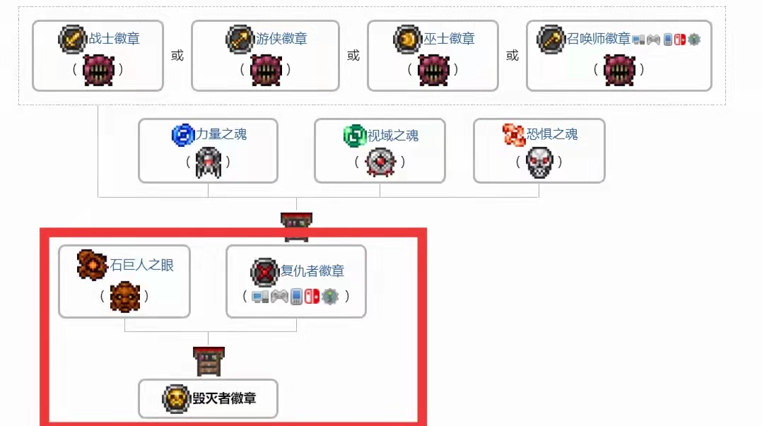 首頁 泰拉瑞亞 問答 毀滅者徽章怎麼得? 2022-11-11 毀滅者徽章獲得方法介紹:在遊戲《泰拉瑞亞》中,毀滅者徽章獲得方法是1個復仇者徽章和1個石巨人之眼在工匠作坊合成,是遊戲中一種困難模式,石巨人後的配飾,裝備上毀滅者徽章之後,能給予玩家 10% 傷害提升和 8% 暴擊率提升。、