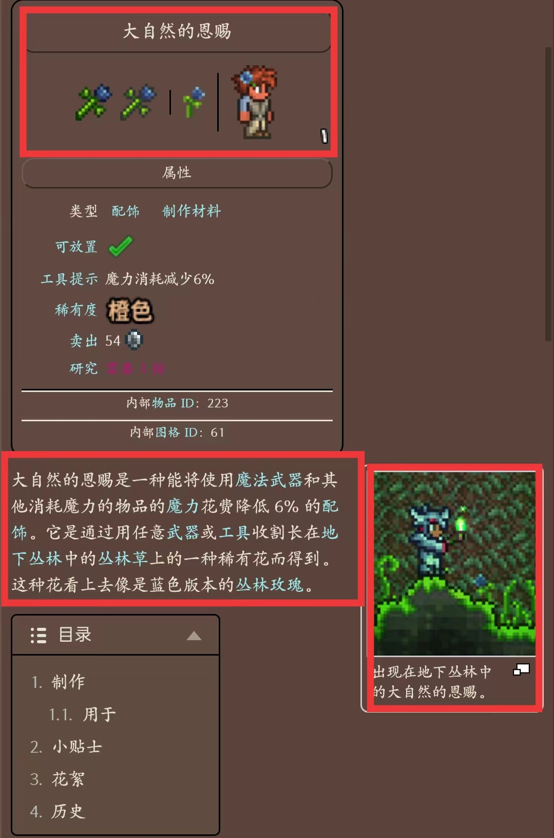 首頁 泰拉瑞亞 問答 泰拉瑞亞自然的饋贈怎麼獲得? 2022-11-12 自然的饋贈獲得方法介紹如下:在游戲《泰拉瑞亞》中,玩家可以通過用任意武器或工具收割長在地下叢林中的叢林草上的一種稀有花而得到,是一種能將使用魔法武器和其他消耗魔力的物品的魔力花費降低6%的配飾。