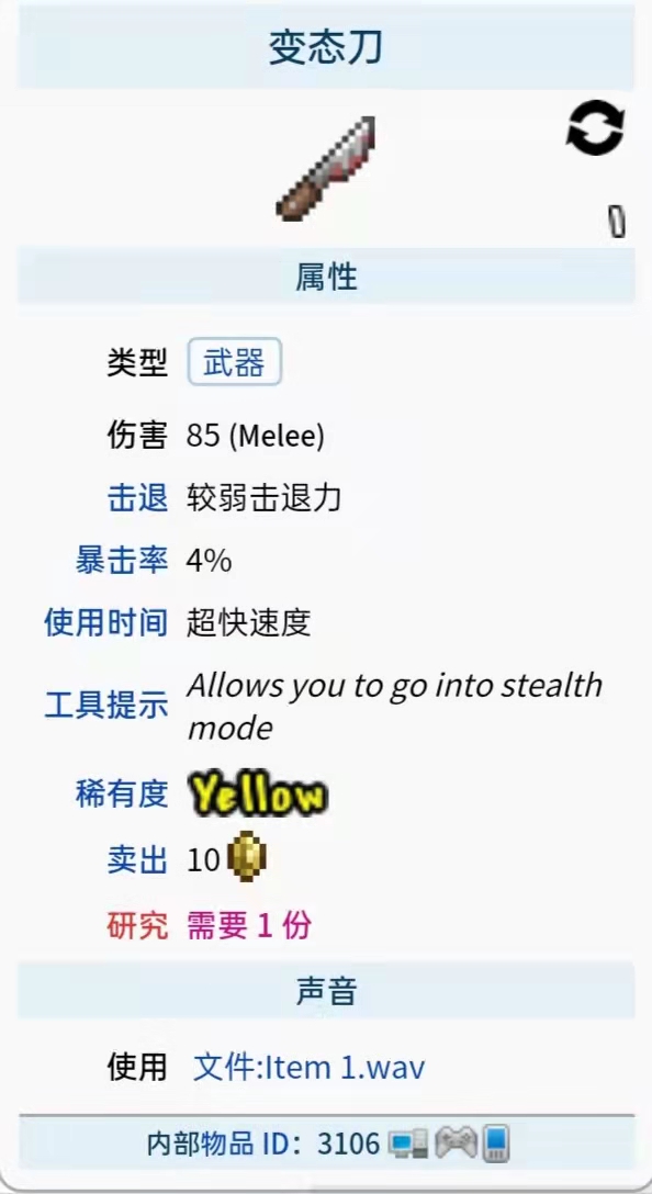 首頁 泰拉瑞亞 問答 泰拉瑞亞變態刀的用法是什麼? 2022-11-12 變態刀用法介紹:在遊戲《泰拉瑞亞》中,變態刀用法時需要手持變態刀並站立不動時,玩家會很快進入隱身模式,使他們變得幾乎完全透明、移動的更加緩慢、且不再會被敵怪瞄準,隱身模式是逐漸切換的,整個過程大約需要一秒鍾,在此期間武器的屬性會穩步提升。
