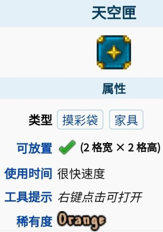 泰拉瑞亞天空匣需要漁力達到75,且只有在高海拔區域(例如釣魚空島)釣魚才能有幾率獲得的寶匣;天空匣的內容相當於天域箱。