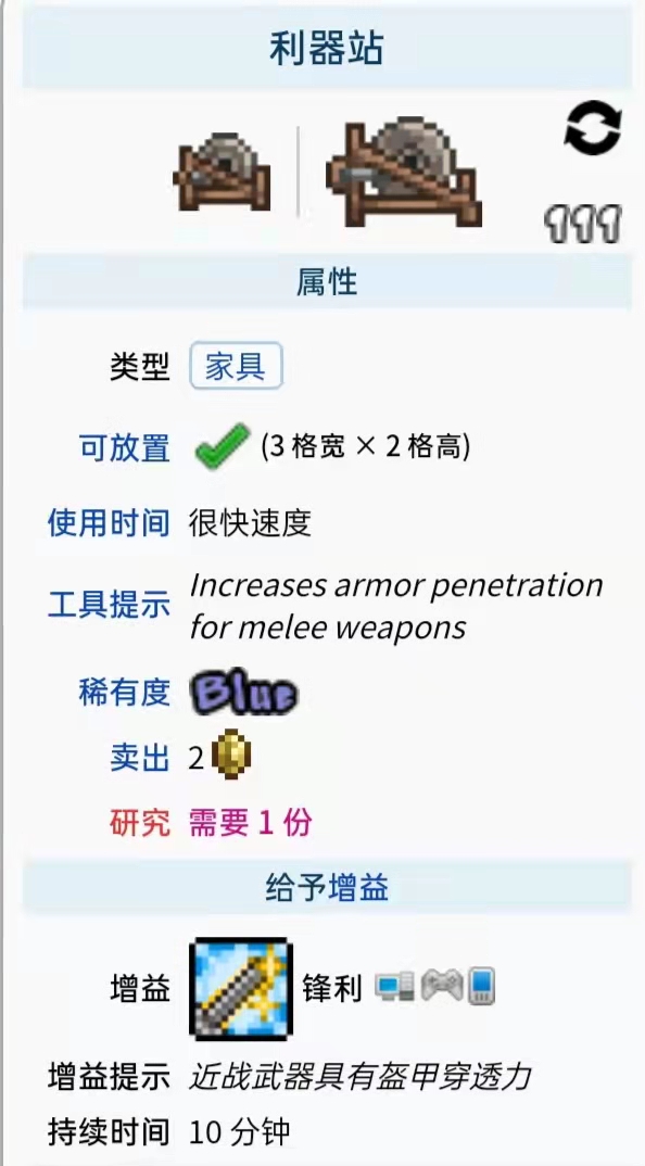 首頁 泰拉瑞亞 問答 泰拉瑞亞利器站怎麼合成? 2022-11-12 利器站無法合成,介紹如下:在遊戲《泰拉瑞亞》中,利器站無法合成,只可以在地下叢林中的地下小屋內找到,是一種傢具物品,放置下來並右鍵點擊後會為所有近戰武器應用鋒利增益,持續10分鍾。