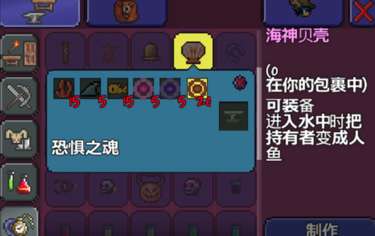 首頁 泰拉瑞亞 問答 泰拉瑞亞海神貝殼掉落概率是多少? 2022-11-13 泰拉瑞亞中海神貝殼無法通過怪物掉落,玩家只能在秘銀氈或者山銅氈處製作獲得。合成所需材料是「鯊魚鰭」X5、「珊瑚」X15、「金魚」X15、「恐懼之魂」X20、「光明之魂」X5、「黑夜之魂」X5。