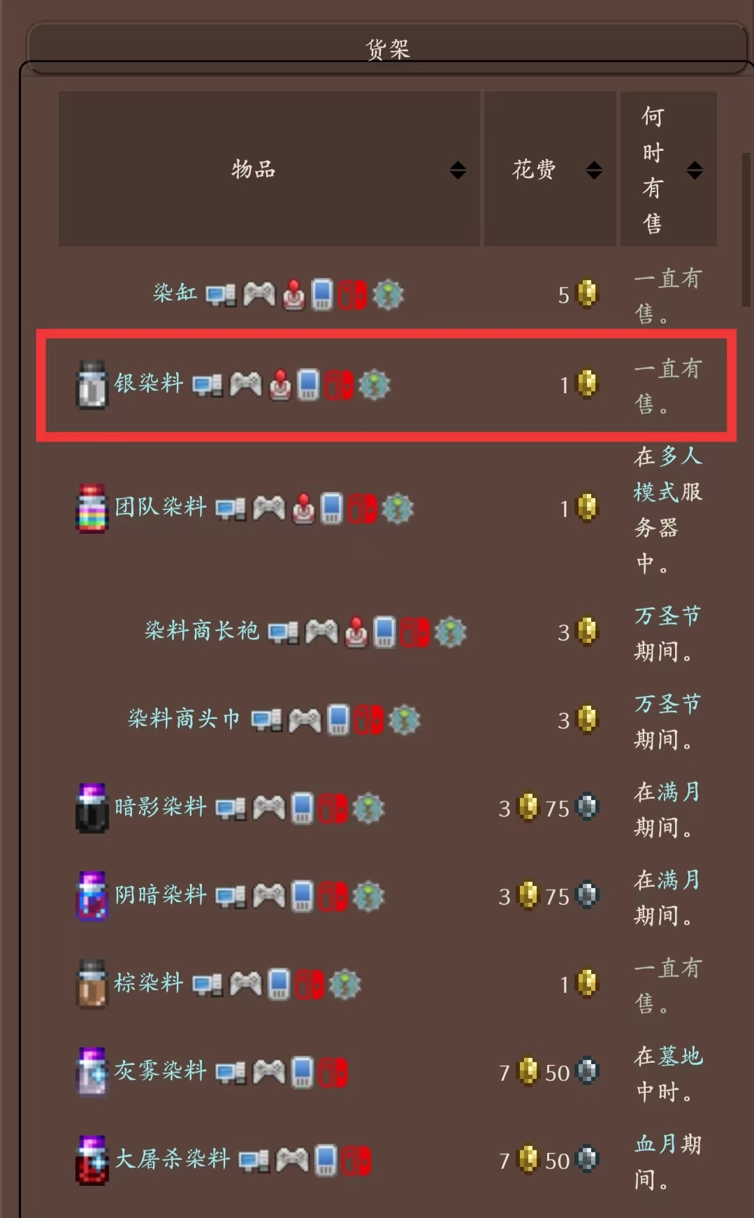 首頁 泰拉瑞亞 問答 泰拉瑞亞銀色染料怎麼獲得? 2022-11-13 銀色染料獲得方法介紹如下:在遊戲《泰拉瑞亞》中,玩家可以在染料商花費1金幣購買銀色染料,染料商入住條件是有空閑房間、已經獲得了一株奇異植物或染料的材料、擁有至少4個城鎮NPC。