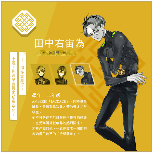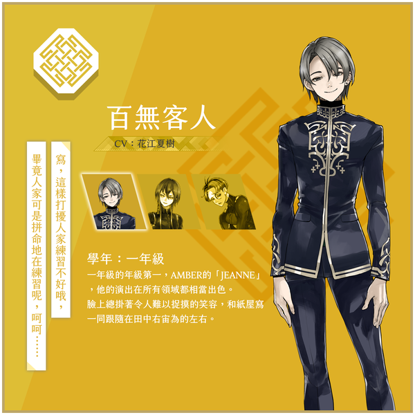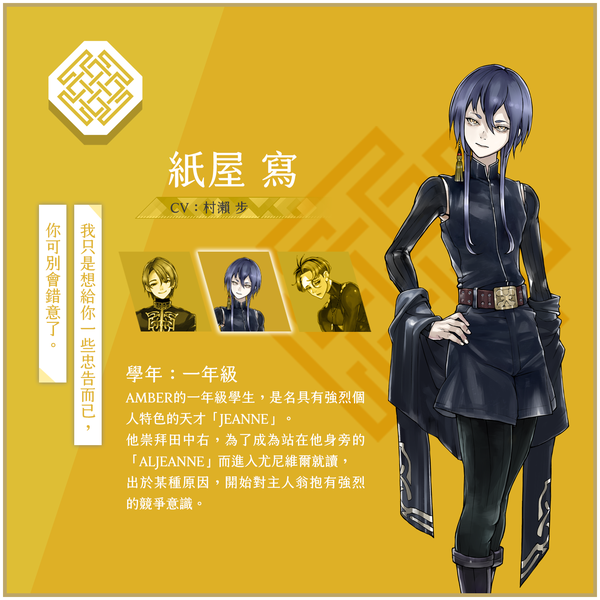 一年級的年級第一,AMBER的「JEANNE」,他的演出在所有領域都相當出色。 臉上總掛著令人難以捉摸的笑容,和紙屋寫一同跟隨在田中右宙為的左右。