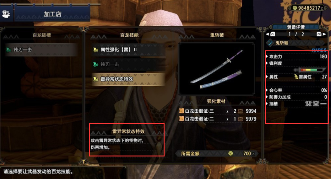 首頁 怪物獵人:崛起 問答 怪物獵人崛起屬性傷害收益高嗎? 2022-11-14 屬性傷害的計算公式為:屬性值x部位吸收/100x特殊補正x斬味補正。以圖中鬼斬破為例,能看到常規屬性方面是是很不錯的,加上雷異常狀態特效的情況下,傷害會提高,所以說屬性傷害收益還是比較高的。