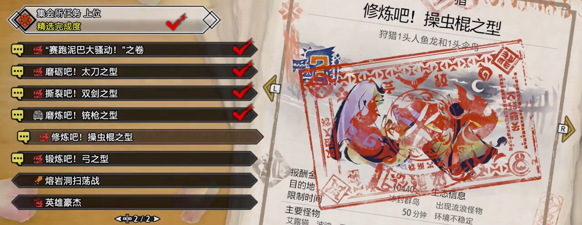 2.蟲棍降龍需要在水芸集會所領取並完成上位6星任務【修煉吧!操蟲棍之型】:需要在50分鐘內,狩獵冰封群島的1頭人魚龍和1頭傘鳥;任務報酬金:10440;解鎖技能後使用ZL A觸發該技能。