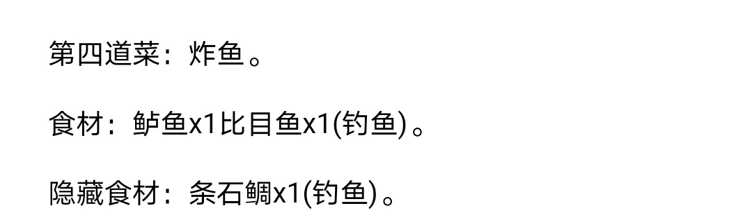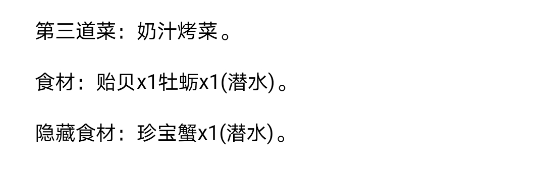 首頁 集合啦!動物森友會 問答 集合啦!動物森友會食譜上沒有的食材有哪些? 2022-11-20 1.第一個是蛤蜊湯,隱藏的食材是一份蝦夷扇貝(潛水)。2.第二個是南瓜派,隱藏的食材為另外兩種南瓜,即黃色南瓜,白色南瓜各一份。3.第三個為奶汁烤菜,隱藏的食材是珍寶蟹一份。4.第四個為炸魚,隱藏的食材為一條石鯛魚。