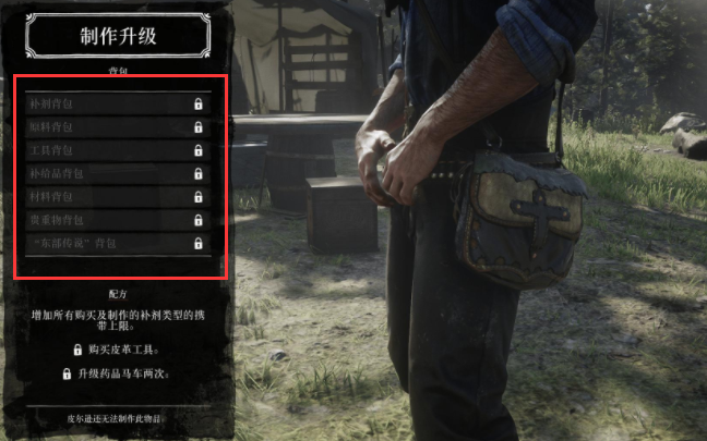 首頁 荒野大鏢客2 問答 荒野大鏢客2皮革工具怎麼解鎖? 2022-11-27 在完成營中利奧波德·施特勞斯的高利貸任務之後,營地的捐贈箱旁邊會解鎖賬本選項,打開賬本翻到最後一頁花費225營地資金解鎖制皮工具,有了制皮工具就能用材料升級背包了。可升級製作如下七種背包: