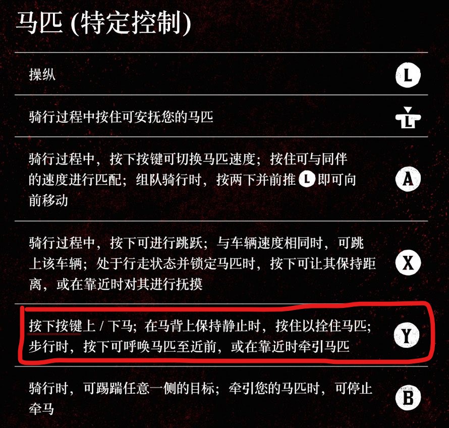 根據官方發布的手柄操作說明來看,在操作馬匹的選項裡面,按下按鍵「Y」可以實現上馬,下馬,具體的話,可以看官方發布的操作圖