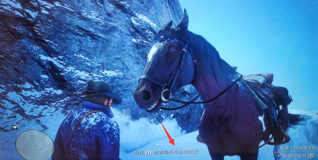 在荒野大鏢客2中我們走到馬的旁邊,就會出來提示,按住L1就可以查看你所存放的武器。如果有時候忘記了,一定要靠近馬多試幾次。