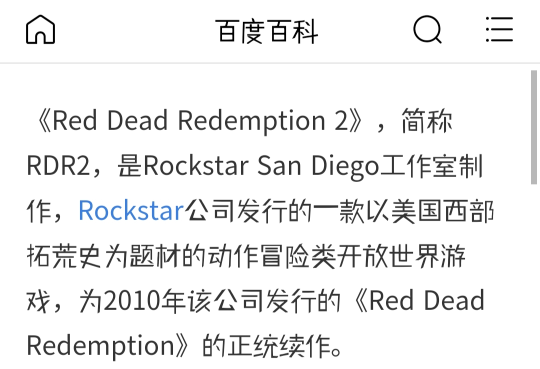 首頁 荒野大鏢客2 問答 大表哥2英文原名是什麼? 2022-12-04 大表哥2英文原名是Red Dead Redemption 2,簡稱RDR2。是一款以美國西部拓荒史為題材的動作冒險類開放世界游戲。
