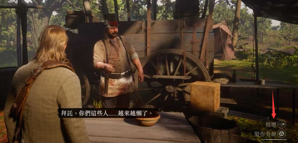 首頁 荒野大鏢客2 問答 荒野大鏢客2皮毛怎麼給營地? 2022-12-05 荒野大鏢客2中皮毛可以捐贈到營地的廚子皮爾遜,在營地中找到皮爾遜就可以捐贈皮毛。1、首先將皮毛帶到營地,隨意放在一個地方,皮毛會自動保存到物品欄2、去到廚子皮爾遜處,點擊捐贈即可