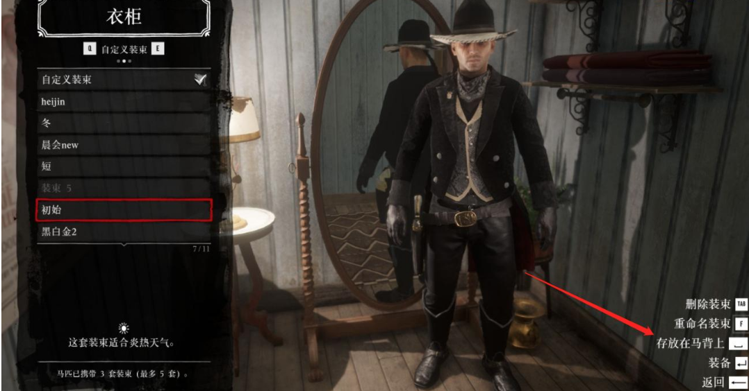 首頁 荒野大鏢客2 問答 荒野大鏢客2怎麼攜帶厚衣服? 2022-12-05 在荒野大鏢客2游戲中,玩家想要攜帶厚衣服可以將衣服放在馬上,打開營地衣櫃選擇禦寒服,右下角有一個選擇存放在馬上,在營地換衣服處選套裝時選擇自定義,再選存放在馬鞍包裡面。