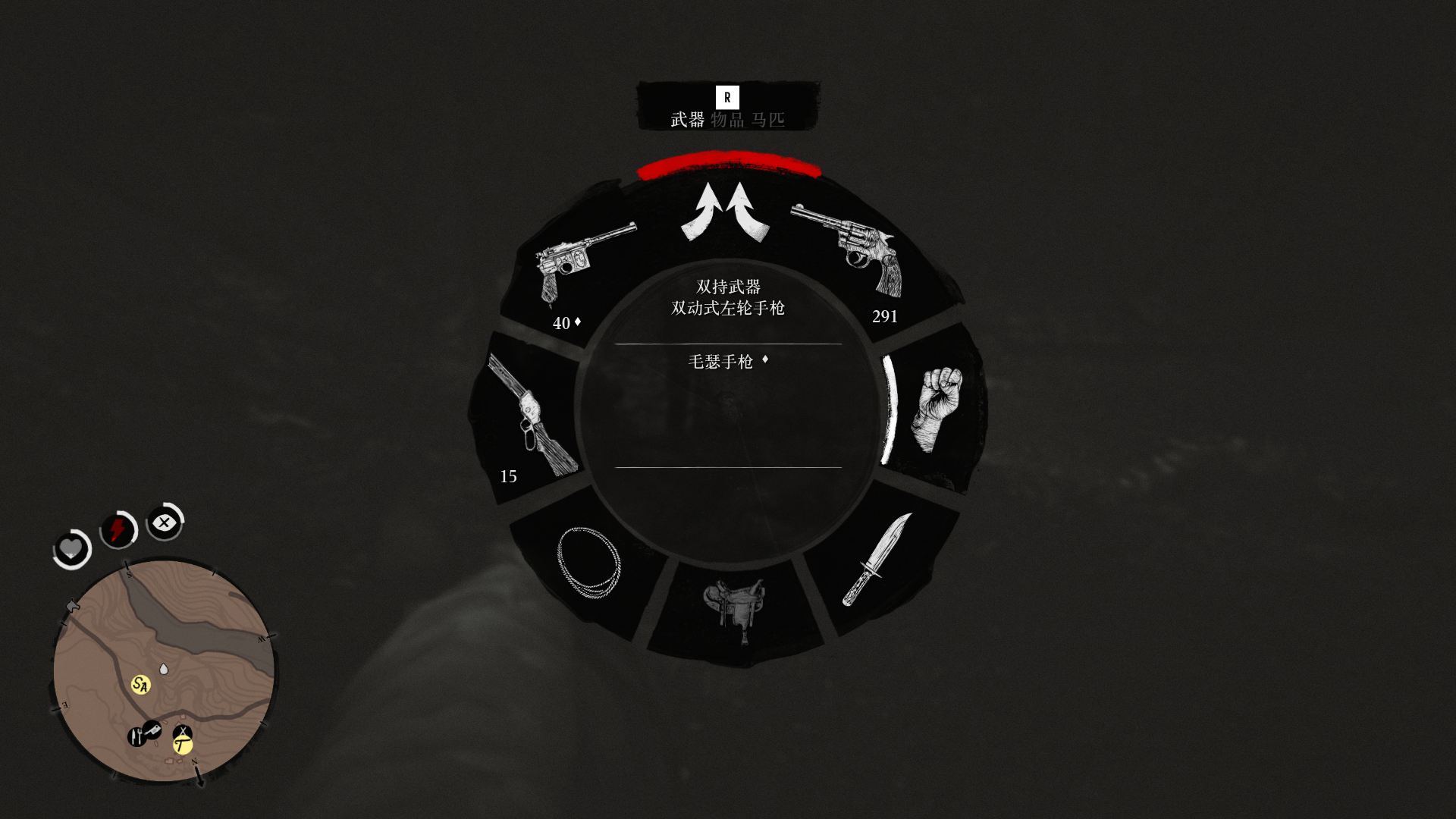 首頁 荒野大鏢客2 問答 荒野大鏢客2怎麼拿兩把左輪? 2022-12-06 1.玩家在荒野大鏢客2游戲中想要將手中的槍支變成兩把左輪的話,可以先裝備兩把左輪,然後按下鍵盤上的Tab鍵,選中如圖所示的圖標。2.最後就可以使用兩把左輪了。