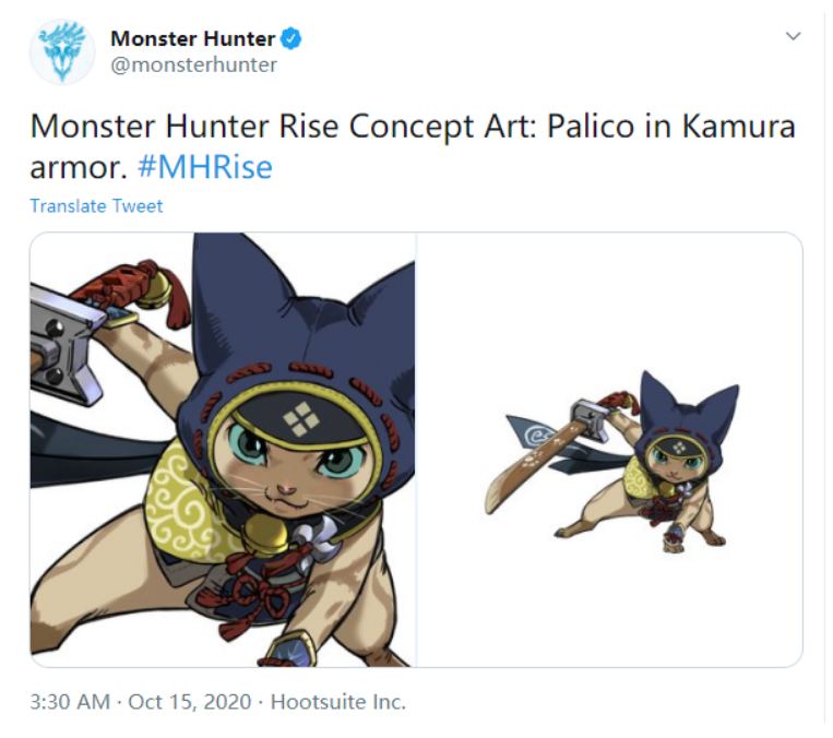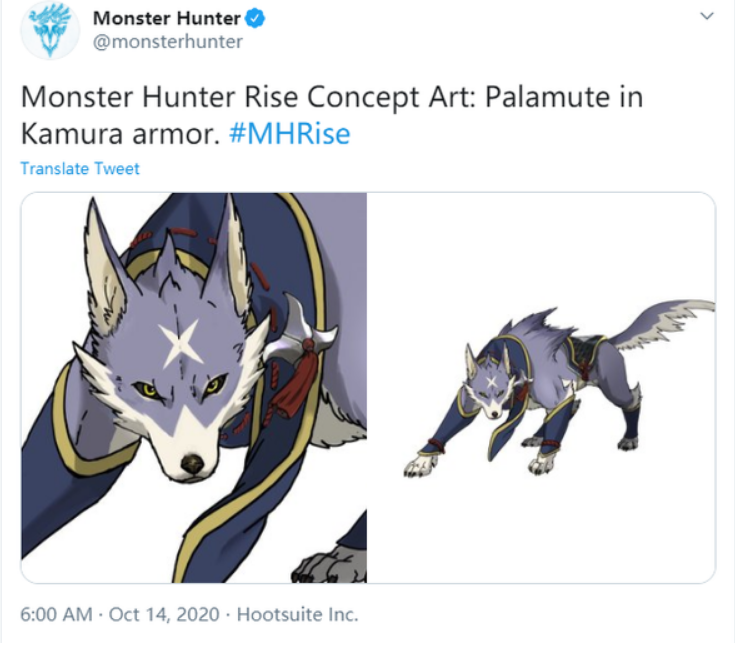 「怪物獵人」官方在推特展示了《怪物獵人:崛起》中穿著盔甲的牙獵犬和艾露貓的最新概念圖。《怪物獵人:崛起》使用RE引擎製作,在NS上能以30幀運行,最多能支持四名獵人共同狩獵。