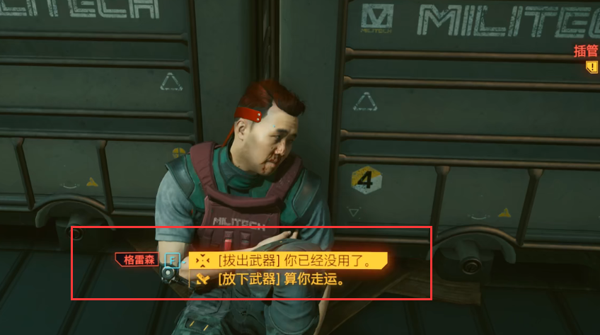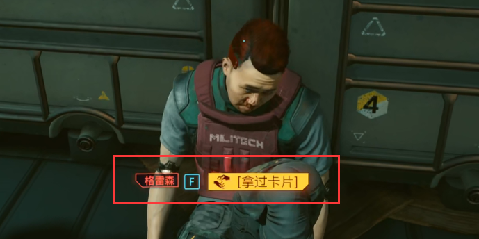 格雷森的處理方式:擊敗格雷森後審問他,在選擇選項時選擇放下武器,然後格雷森會給一張門卡,拿過卡片後即可打開一旁的箱子。