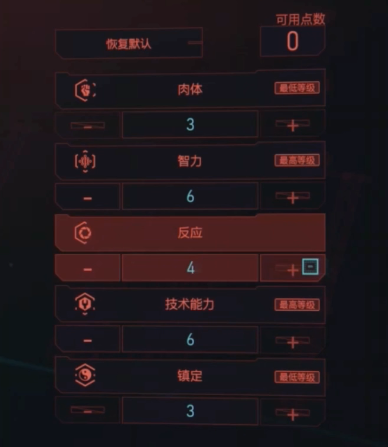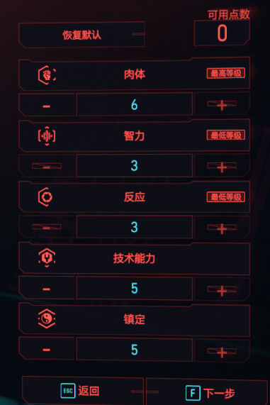 首頁 賽博朋克2077 問答 賽博朋克2077初始點數怎麼點? 2022-12-20 1、流浪小子肉體點到6,智力3,反應5,技術能力3,鎮定3。2、街頭小子肉體點到3,智力6,反應4,技術能力6,鎮定3。3、公司職員肉體點到6,智力3,反應3,技術能力5,鎮定5。
