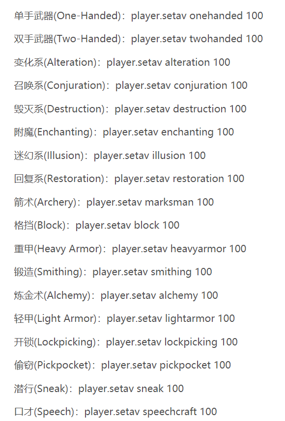 首頁 上古捲軸5:天際 問答 上古卷軸5技能等級代碼是什麼? 2022-12-21 【上古卷軸5:天際】的等級技能代碼為「player.setav 技能名稱 100「,數字與想要升級的技能都能隨便更改,下圖為目前游戲所有技能作弊碼合集。以上就是有關於上古卷軸5技能等級代碼的介紹。