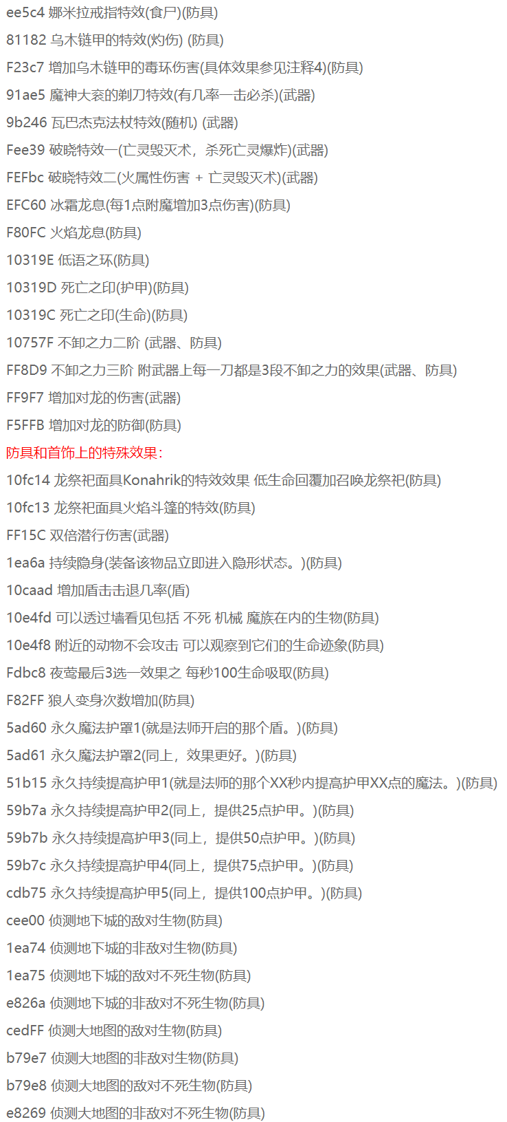 首頁 上古捲軸5:天際 問答 上古卷軸5附魔裝備代碼是什麼? 2022-12-24 1、防具和首飾上和一些其他的特殊附魔代碼如下:2、防具、首飾和武器上的基本附魔代碼如下:3、在武器上的特殊附魔代碼如下,控制台輸入playerenchantobject 物品代碼 附魔效果即可,注意空格。